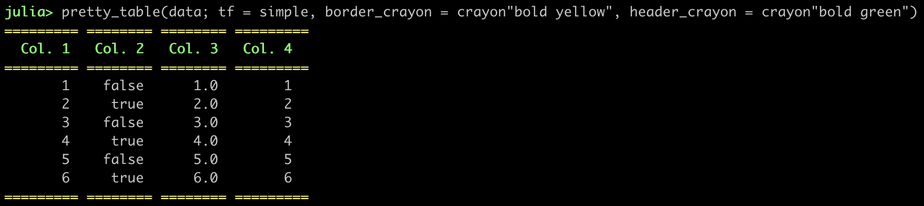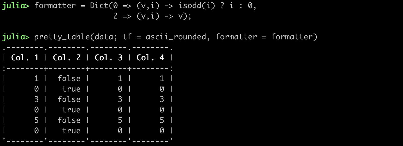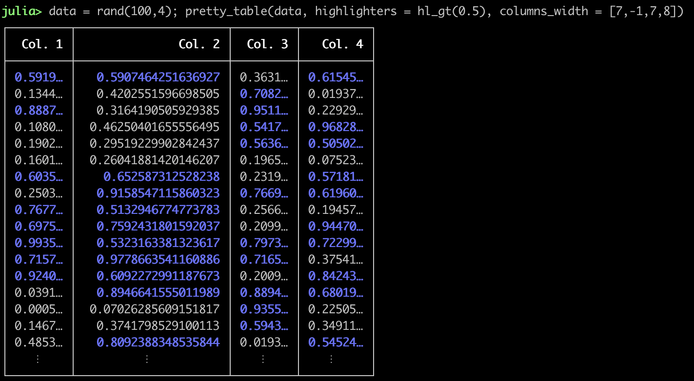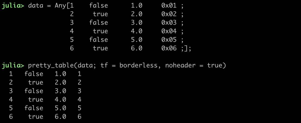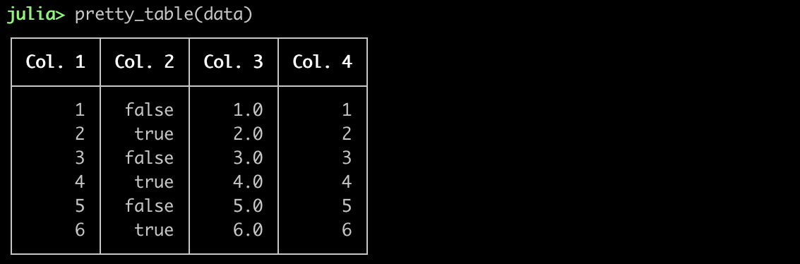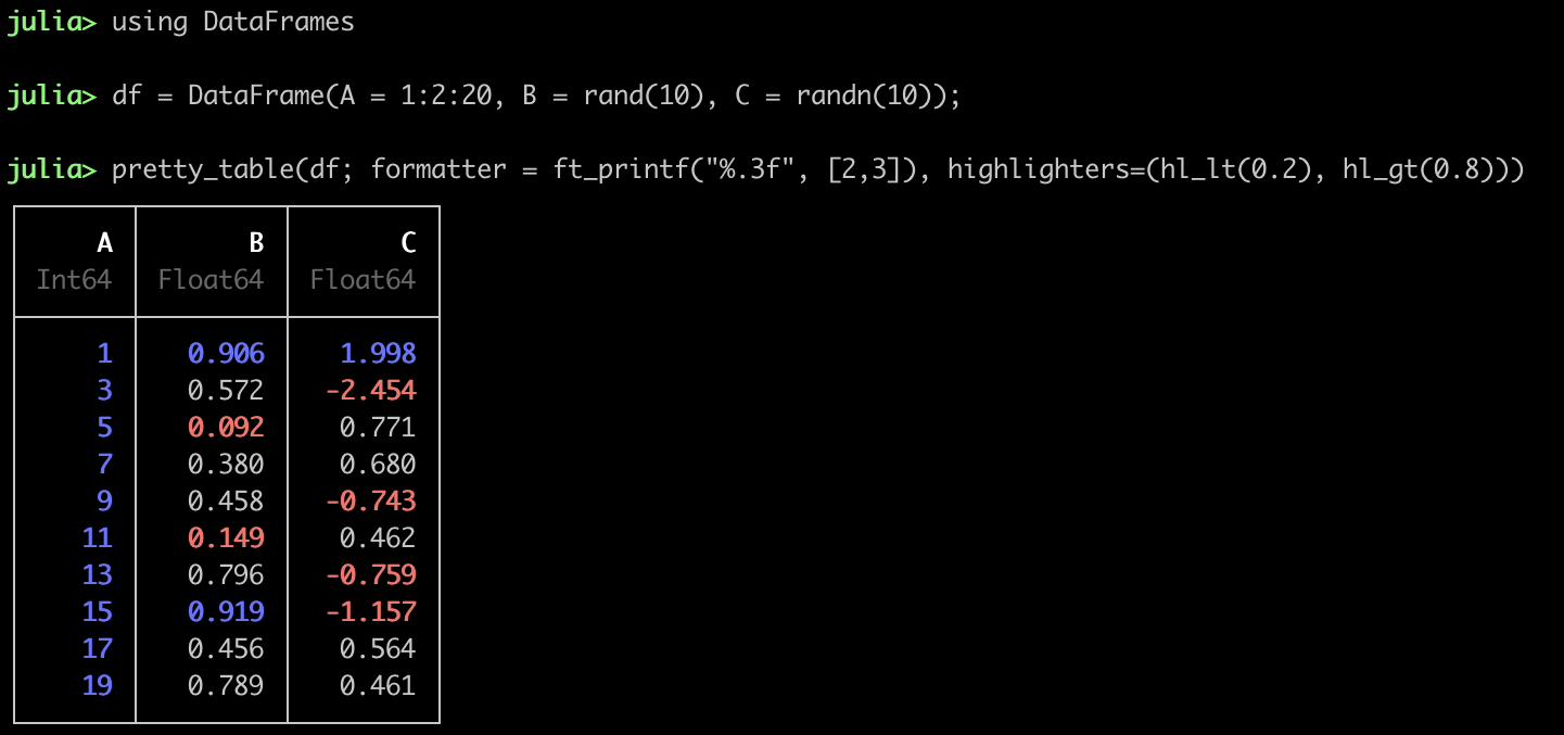 Since this package has support to the API defined by Tables.jl, then many formats, e.g DataFrames.jl, can be pretty printed: