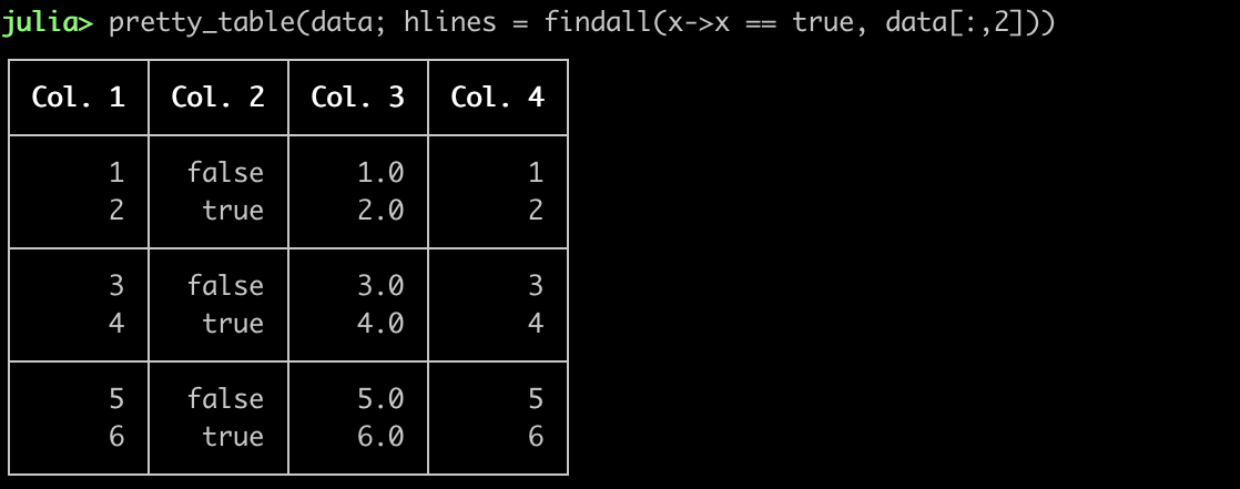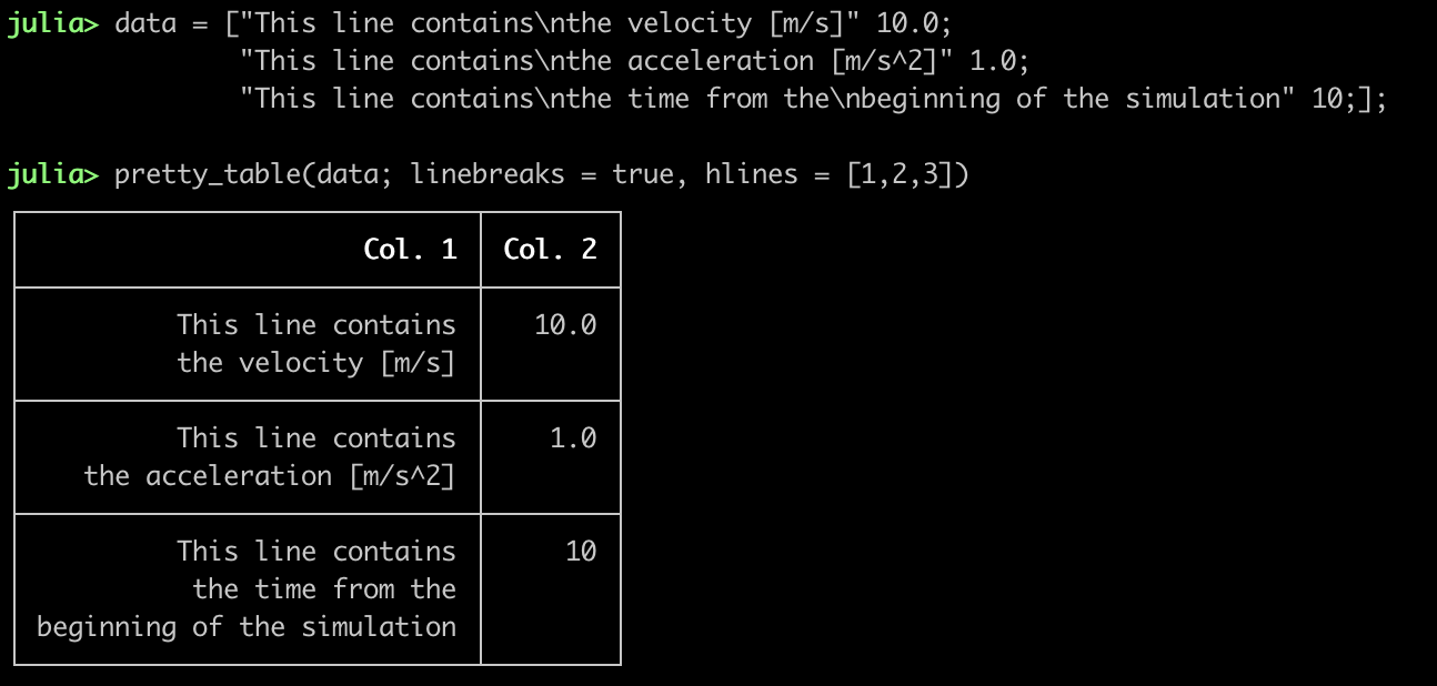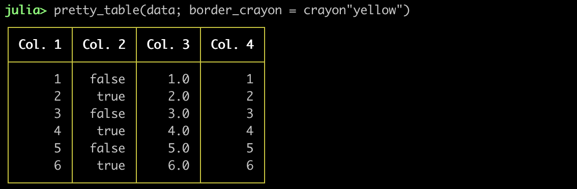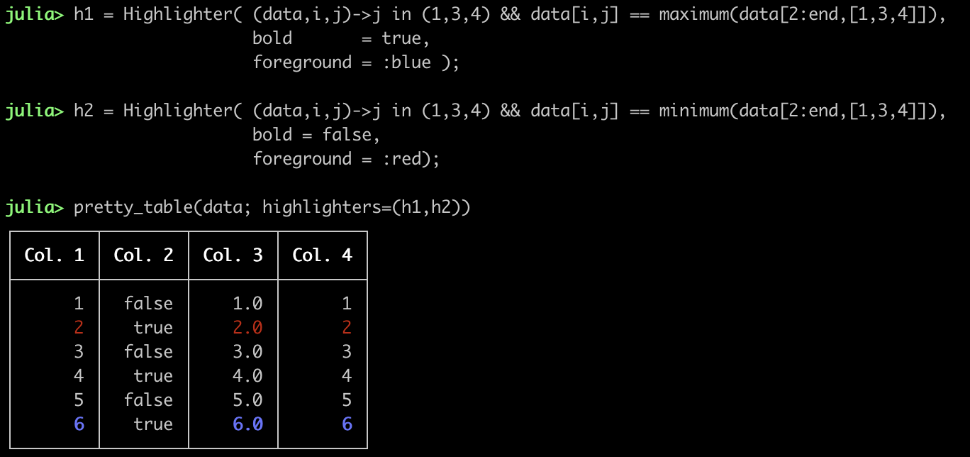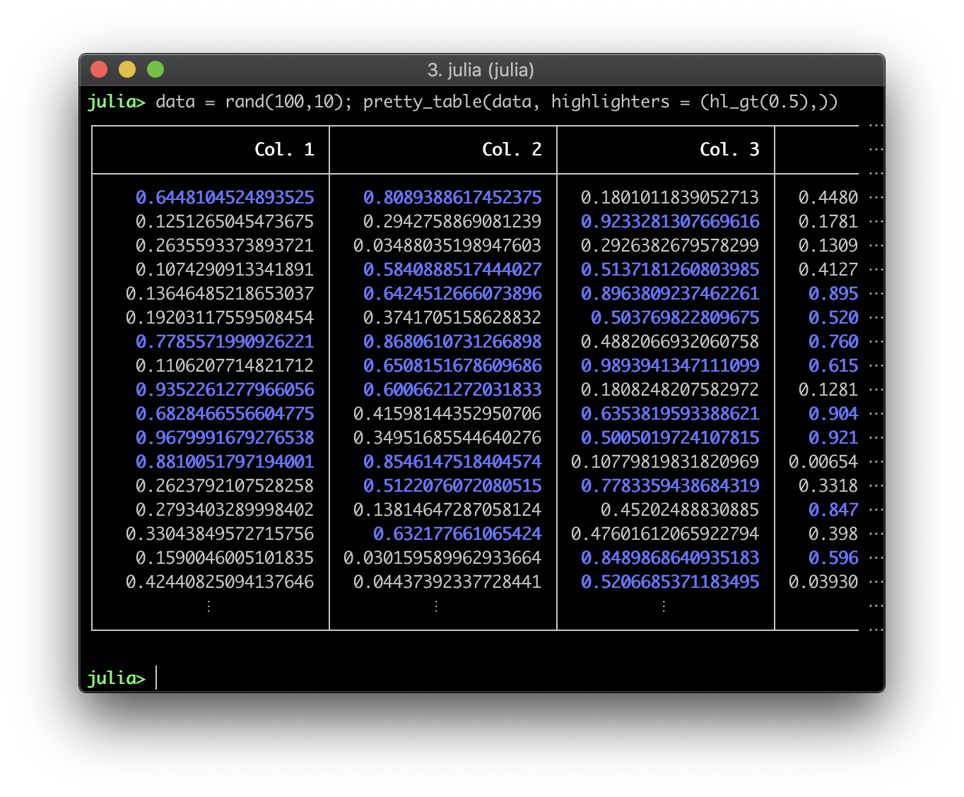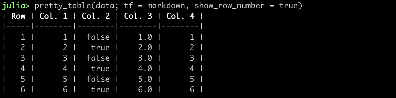 Since this package has support to the API defined by Tables.jl, then many formats, e.g DataFrames.jl, can be pretty printed: