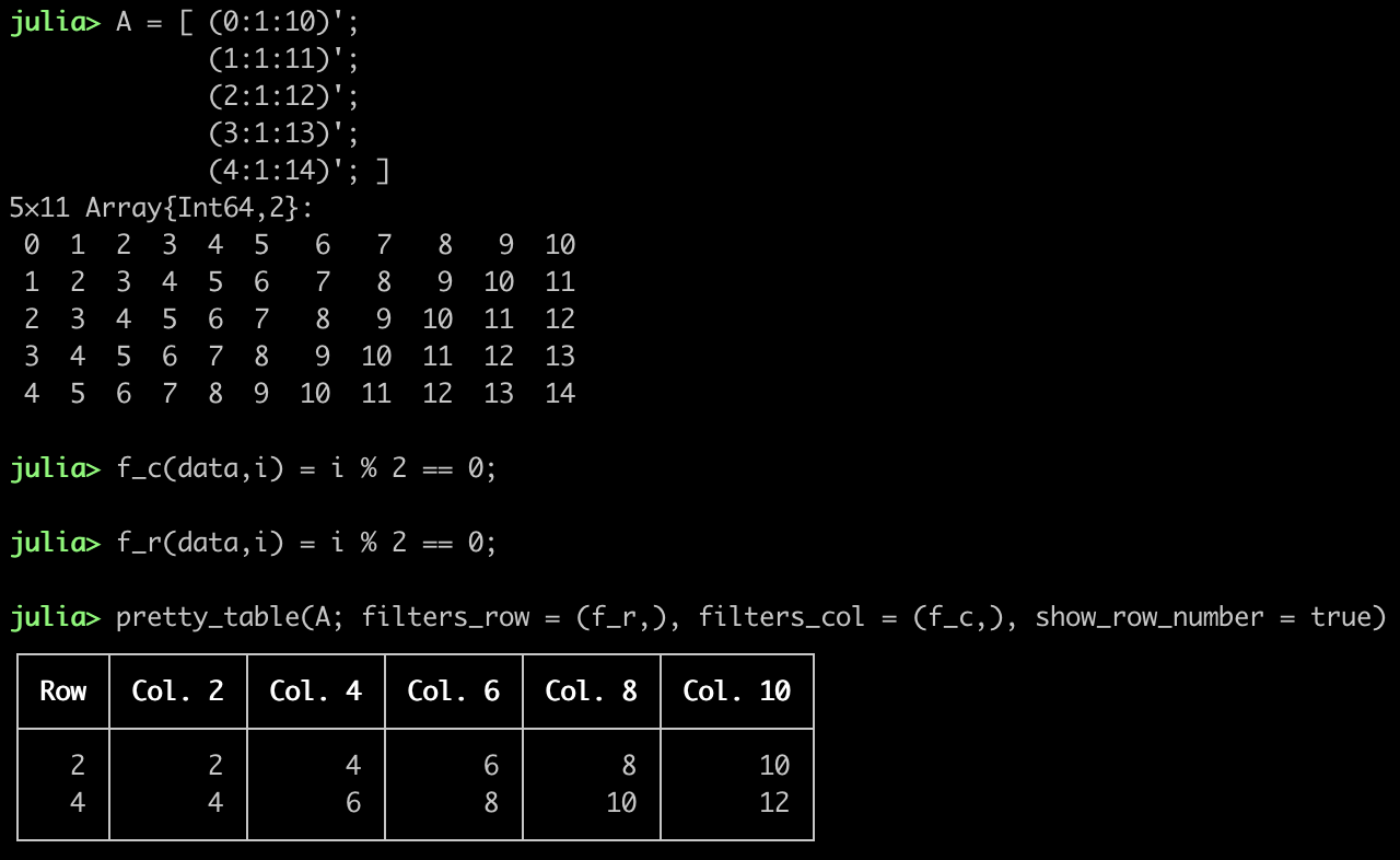 In the following, it is shown how the filters can be used to print only the even rows and columns: